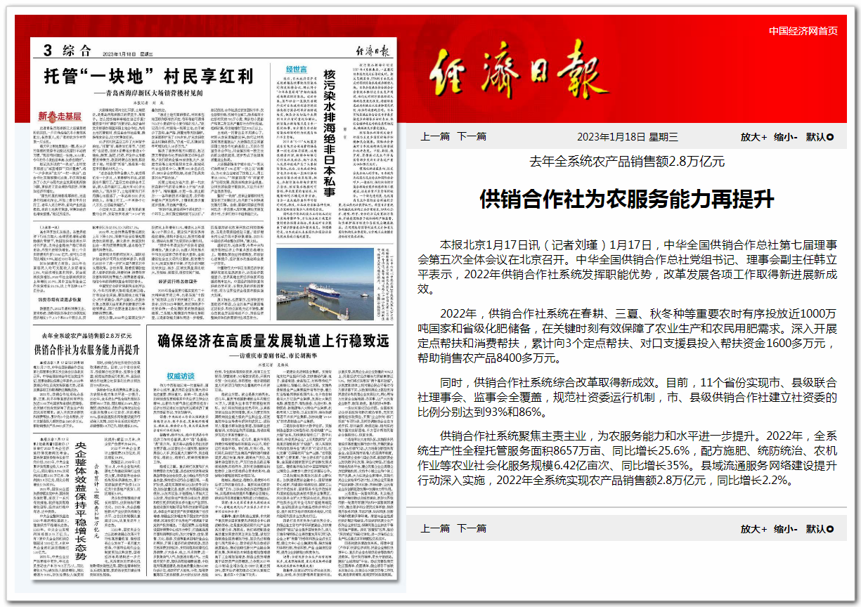 1月17日,中華全國供銷合作總社第七屆理事會第五次全體會議在北京召開。中華全國供銷合作總社黨組書記、理事會副主任韓立平表示,2022年供銷合作社系統(tǒng)發(fā)揮職能優(yōu)勢,改革發(fā)展各項工作取得新進展新成效。